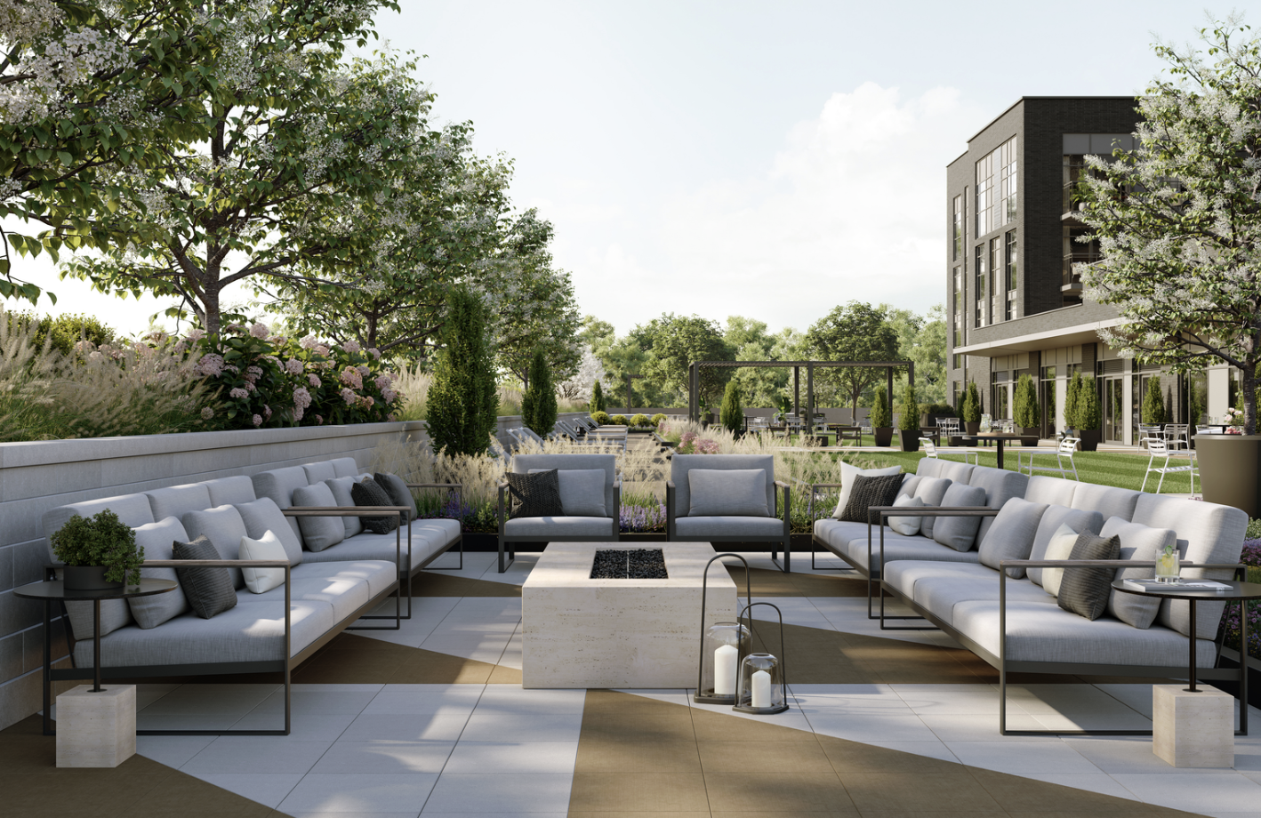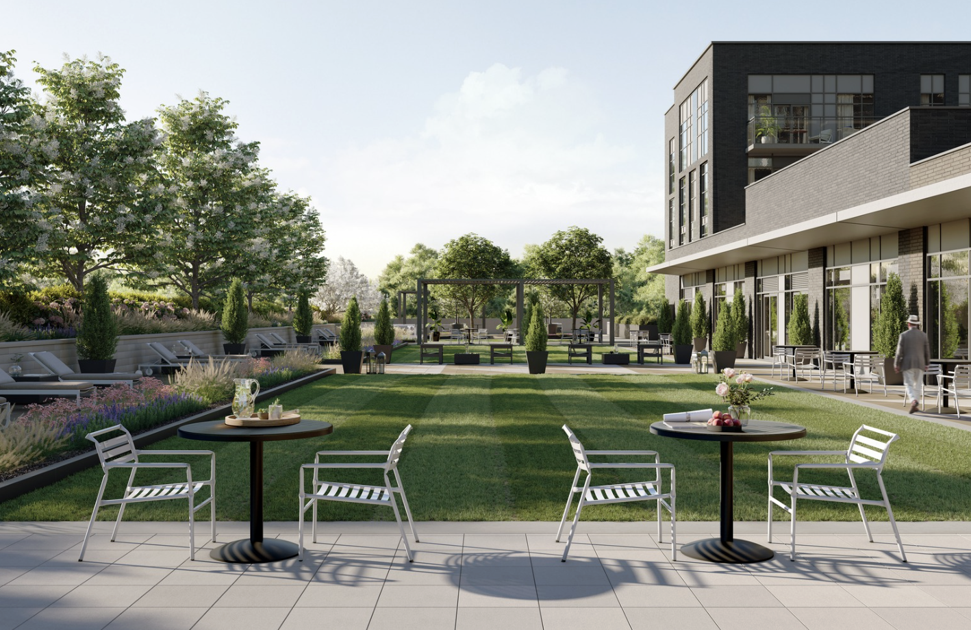 Building Amenities: Lobby, Fitness Studio, Party Room, 30,000 sq ft Outdoor Terrace with BBQ Stations, Dining & Lounge Areas, and Bocce Ball Court